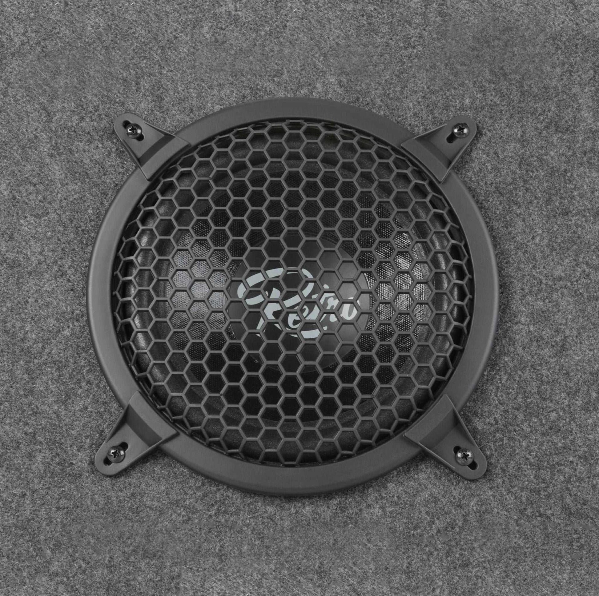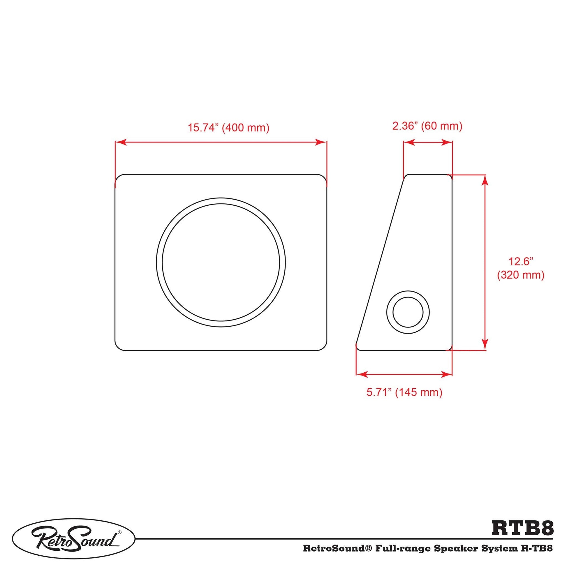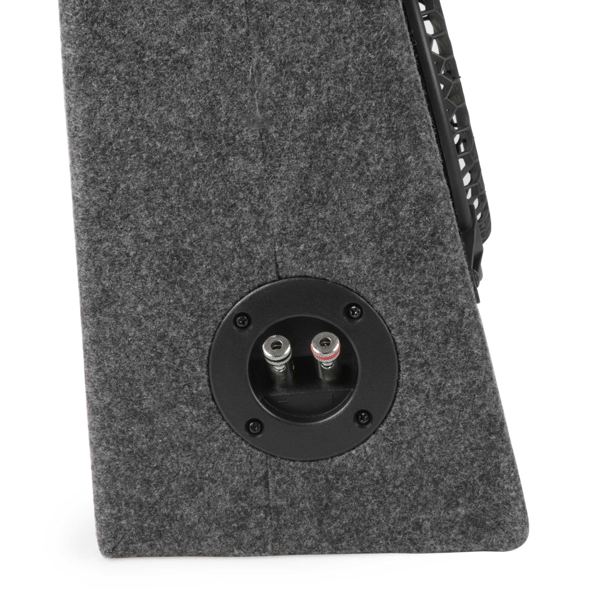 The RetroSound® R-TB8 is a ported full-range speaker enclosure. These wedge shaped speaker boxes work great behind the seats of trucks, SUV's, hatchbacks and coupes. They feature an 8-inch bass driver for great low frequency response and soft-dome tweeters for smooth, clear highs. They are finished in a durable gray carpeting and have chrome speaker terminals. Power handling is 175 watts. Price is per two speaker boxes, one for the driver's side and one for the passenger side.