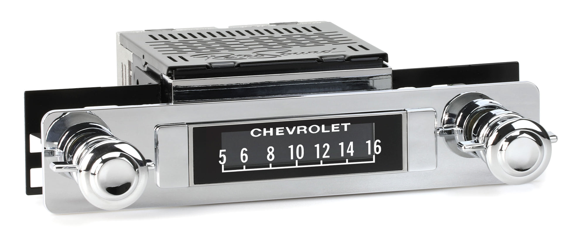 The RetroSound® Apache Radio replaces the original factory radio in your 1954 Chevrolet Pickup Truck, featuring the simple but elegant two-shaft control layout of the original factory radios. The Apache fits the dash in your vintage truck without cutting or modifying the original factory opening. The bezel installs from behind the dashboard, leaving the chrome trim around the nose of the radio exposed for a factory appearance. Replica front and rear knobs complete the OEM look by recreating the look and feel of the originals perfectly. Browse radio stations, set favorite channels to presets, stream Bluetooth® audio, and control balance, fader, and tone settings with a period-correct look that blends seamlessly with your classic Chevy truck's interior.
